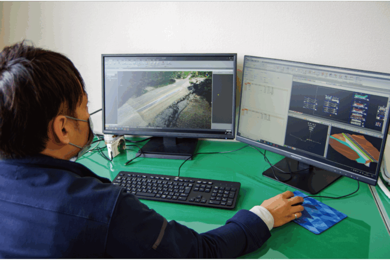 工事図面から3Dの施工データを作成したり、ドローンによる測量や出来形資料の作成などを担当しています。現在は、測量機器の操作や施工機械へのデータ入力の効率化について学んでいるところです。