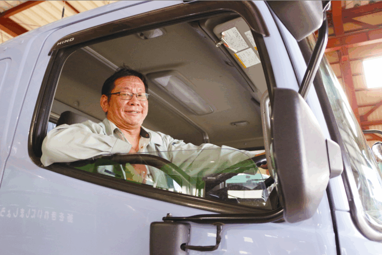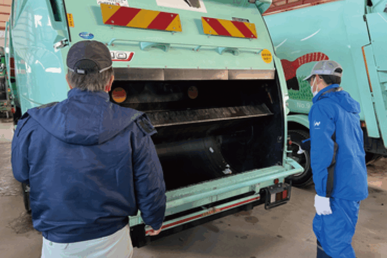 担当しているのは生活ごみの回収業務です。町内会のごみボックスを回収し、各ごみの種類ごとに異なる処理工場へ搬入します。会社の補助を受けて大型免許を取得してから半年が経ち、只今先輩や係長から安全運転の技術を学んでいる最中です。大型車の運転では、巻き込み確認、作業員や歩行者への注意、視野の広さの確保といった点に気を配り、常に周囲を意識して運転しています。ごみ収集の仕事は一見単純に見えても、技術職の一面があり、運転技術の向上や作業の正確さが自分で実感できる点にやりがいを感じていますね。今後は、先輩から教わった安全意識や姿勢を、次の世代に伝えられるよう日々の業務に務めます。